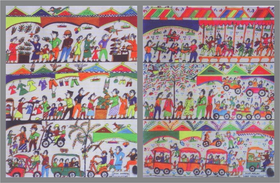 Selain sama-sama memiliki kolom dan mengandung sketsa cerita, tiga lukisan tersebut memiliki kesamaan lain, yaitu: dekoratif. Aku menelisik dekoratif itu akibat tiga lukisan tersebut menempatkan pengulangan gambar tanaman (daun atau pohon), anak panah, garis zig zag, dan atap rumah. Pengulangan tersebut bikin aku teringat lukisan karya Masmundari. Barangkali pengulangan tersebut menjadi pakem yang berdasarkan cara Masmundari melukis pada kertas yang menutup kerangka damar kurung.3
