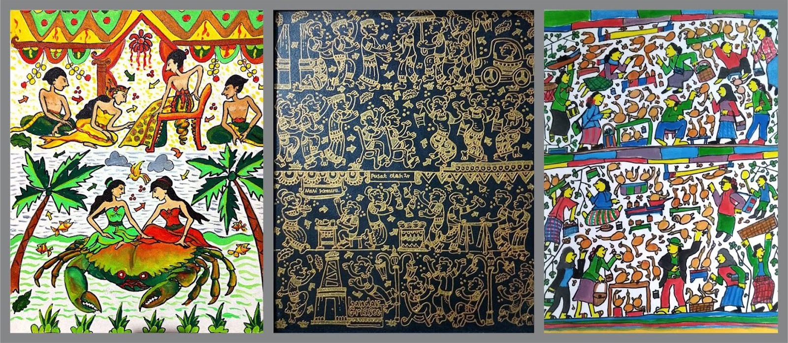 Keterangan: Lukisan Tragedi Yuyu Kangkang (kiri); lukisan Dolan Nak Gresik (tengah); dan lukisan Ikan Ayam (kanan).