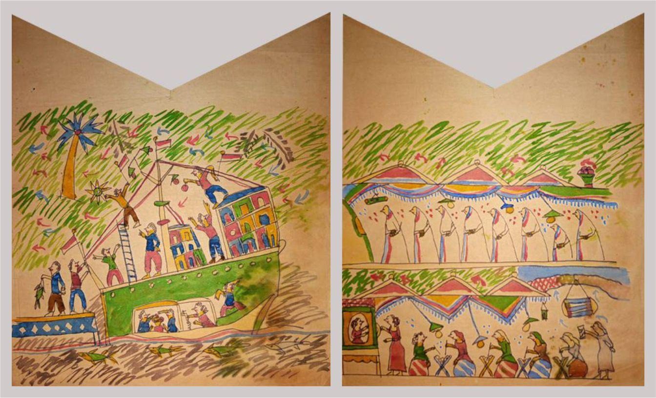 Dua lukisan karya Masmundari koleksi Kris Adji AW menjadi karya tertua kedua pada pameran seni rupa itu. Bentuknya kubus dengan dua segitiga di bagian atas. Dua segitiga itu untuk menutup penguat konstruksi. Sebagai artefak, meski menguning karena berbahan kertas, aku menelisik ada beberapa noda tipis pada lukisan yang bernarasi perempuan-perempuan sedang beribadah (solat berjamaah dan mengaji). Meski begitu, kualitas dua lukisan karya Masmundari koleksi Kris Adji AW sangat terjaga karena warnanya masih terlihat jelas, bersih, dan tidak ada lipatan kertas. Padahal mengoleksi karya seni rupa yang berbahan kertas sangat rawan diserang jamur.6