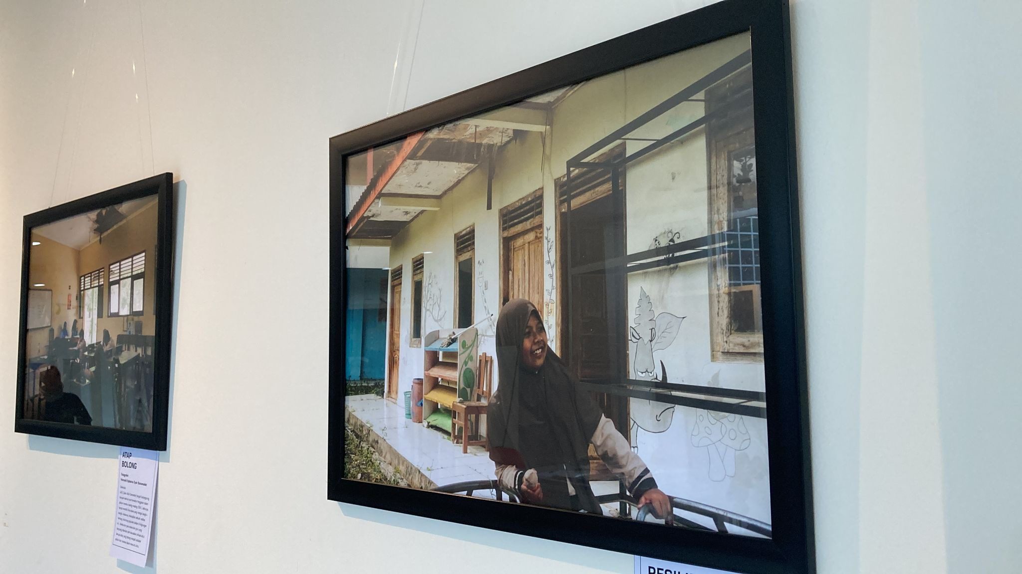 Berjalan beberapa tapak kemudian, terdapat potret SDN Jatimulyo, Kabupaten Bantul. Pada posisi ini, mata saya terbelalak. Deretan gambar itu menampilkan bangunan yang cukup ringkih. Delapan murid dan dua guru berkegiatan di ruang kelas yang atap-atapnya bolong. Cat temboknya bahkan mulai terkelupas. Halaman sekolah mereka juga tampak tak terawat, juga arena bermain yang besi-besinya mulai berkarat. Salah satu foto berjudul “Resiliensi” menunjukkan ironi yang mendalam. Senyum tulus seorang siswi sembari memegang es krim berlatar gedung sekolahnya yang lebih layak disebut gudang terbengkalai.