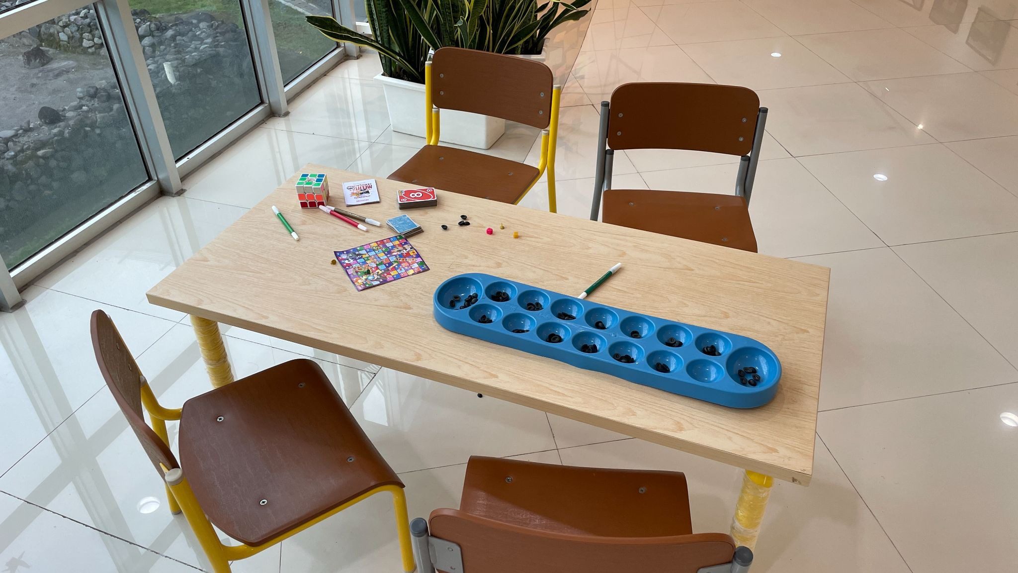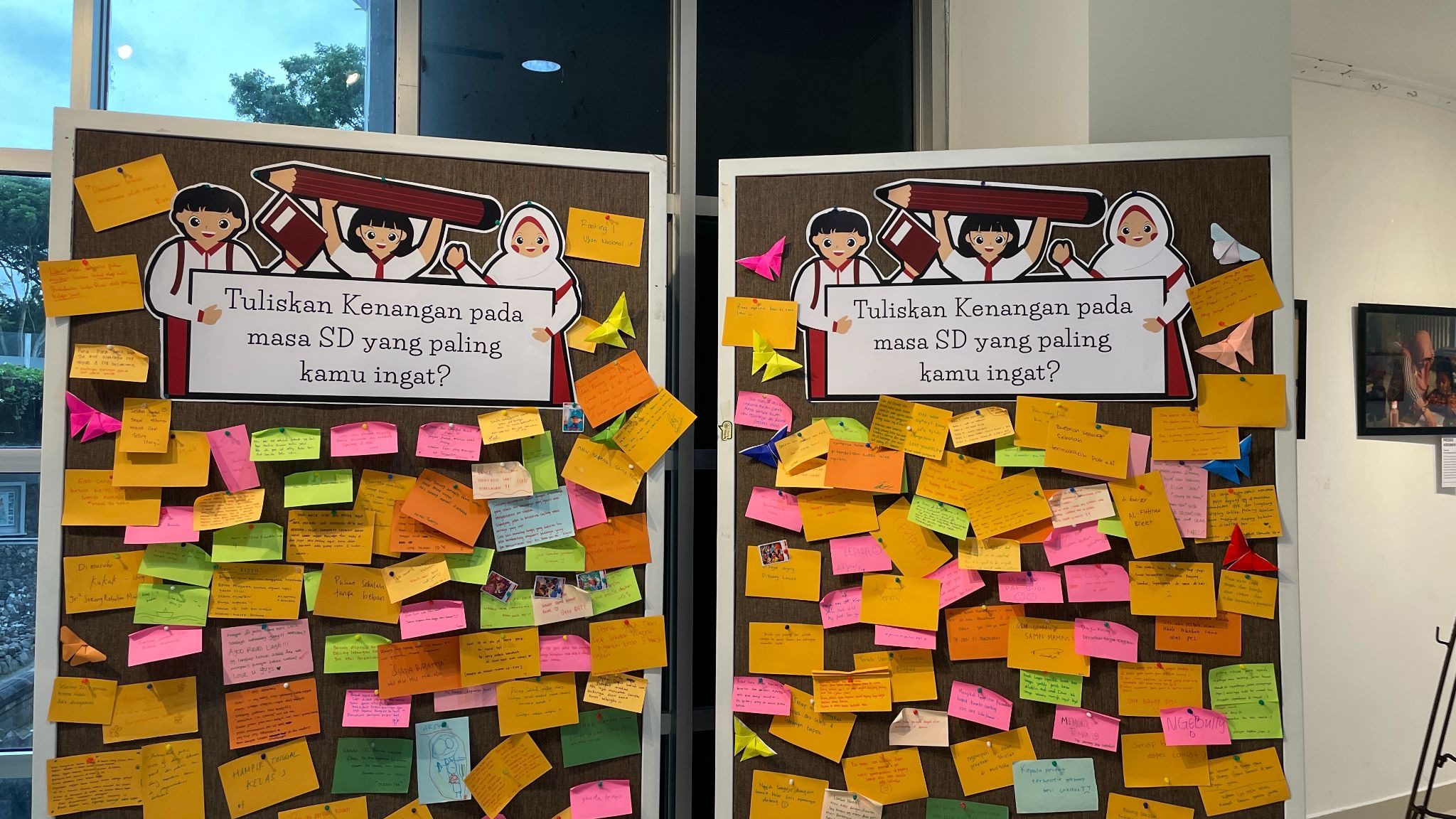 Ketika memasuki lorong eksibisi, saya seolah merasa kembali ke sekolah dasar. Kursi-kursi kecil, tumpukan kertas origami, pemilihan font dengan bentuk besar dan warna mencolok. Mencipta ilusi bahwa saya tidak sedang berada di universitas, tapi sekolah dasar, tempat saya berlari-lari tatkala dikejar oleh om dan tante pembawa jarum suntik untuk imunisasi. Bayangan itu kini tampak lucu, dan seolah hadir di depan mata.