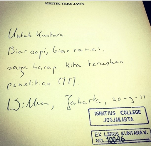 “Untuk Kuntara, biar sepi, biar ramai, saya harap kita teruskan penelitian MM (Naskah-naskah Merapi-Merbabu).